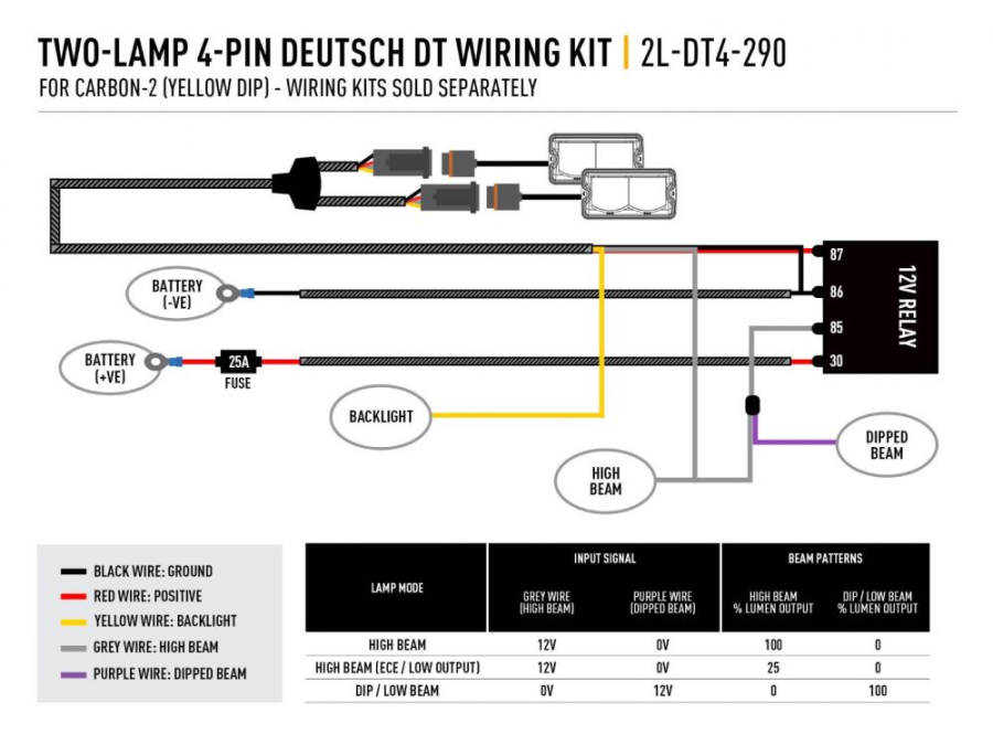 Īpaši izstrādāts divu Carbon-2 augstas veiktspējas LED luktru ar dzelteno tuvās gaismas (Yellow Dip Beam) un fona apgaismojuma (Backlight) funkciju uzstādīšanai. 4-pin Deutsch savienotājs nodrošina ātru un nekļūdīgu uzstādīšanu – konfigurācija nav nepieciešama.